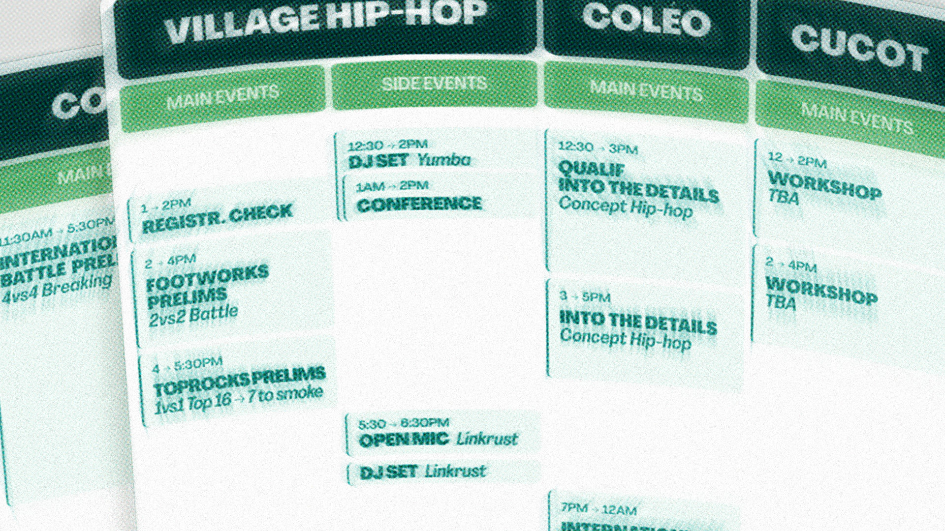 The lineup is getting bigger! It’s starting to get hard to keep track of what’s happening at Coléo, the Hip-Hop Village… Download the schedule to get an overview of the program!